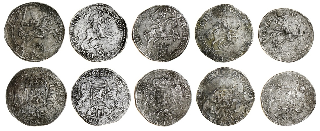 DE LIEFDE: Netherlands, 'Rider' Ducatons (5), Holland [2], 1673; another, 1676 (Delm. 1014; Dav. 4930); Overijssel, 1676 (Dav. 4936); West Friesland [2], 1674; another, 1676 (Delm. 1020; Dav. 4940), 'sea-salvage' appearance, otherwise generally fine or better (5)