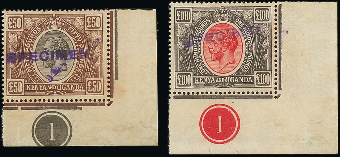 £50 black and brown and £100 red and black, both from the lower right corner of the sheet with plate number, both handstamped "
