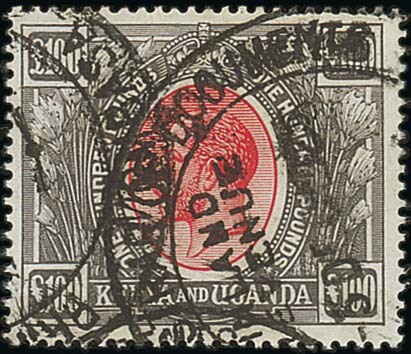 £100 red and black cancelled with Mombasa Principal Registrar of Documents datestamp; fine and rare. S.G. 105, £2,250. Photo