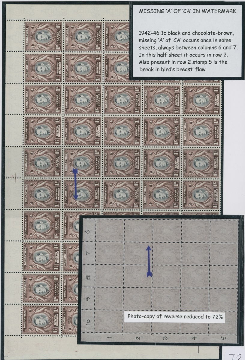 1c. black and chocolate-brown, perf 13¼x13½, upper half of sheet (10x5) with full margins, showing varieties break in bird's breast (R.2/5) and missing "A" of "CA" in watermark (R.2/6-7) se-tenant, fine unmounted mint. S.G. 131a/ab/ae