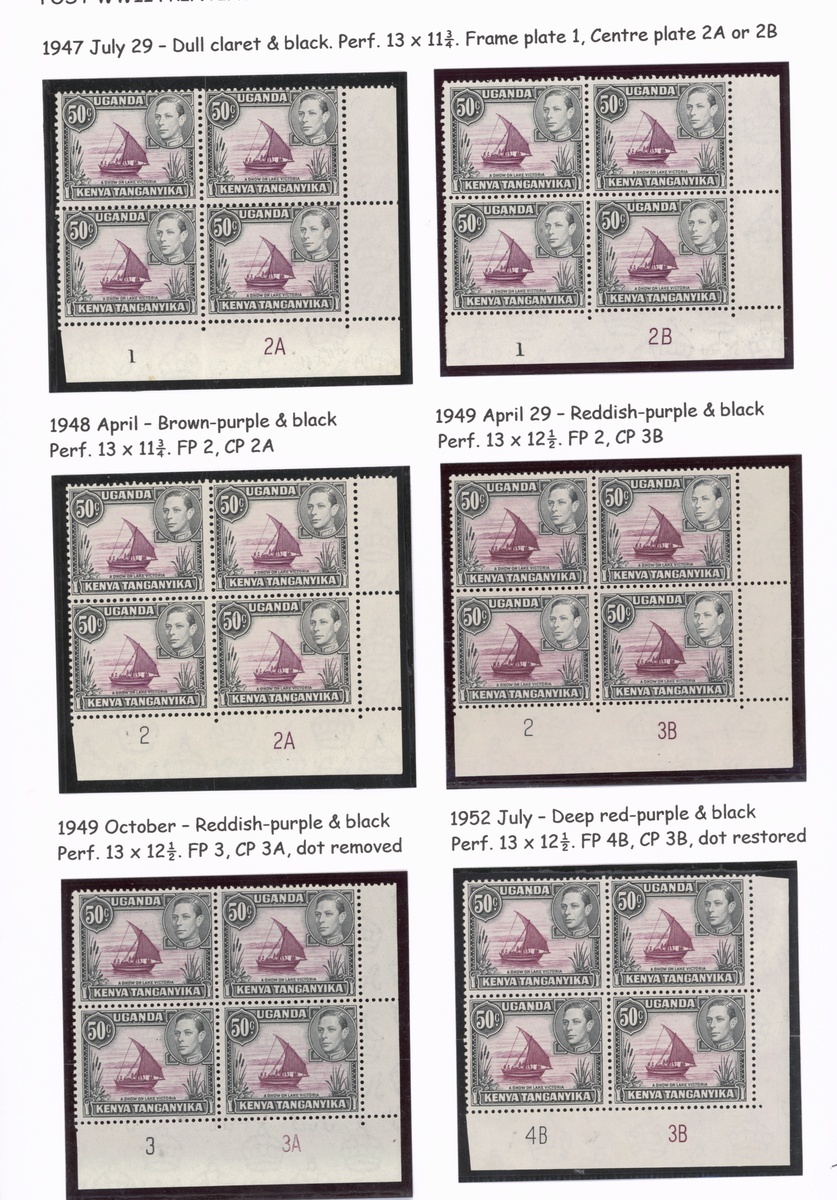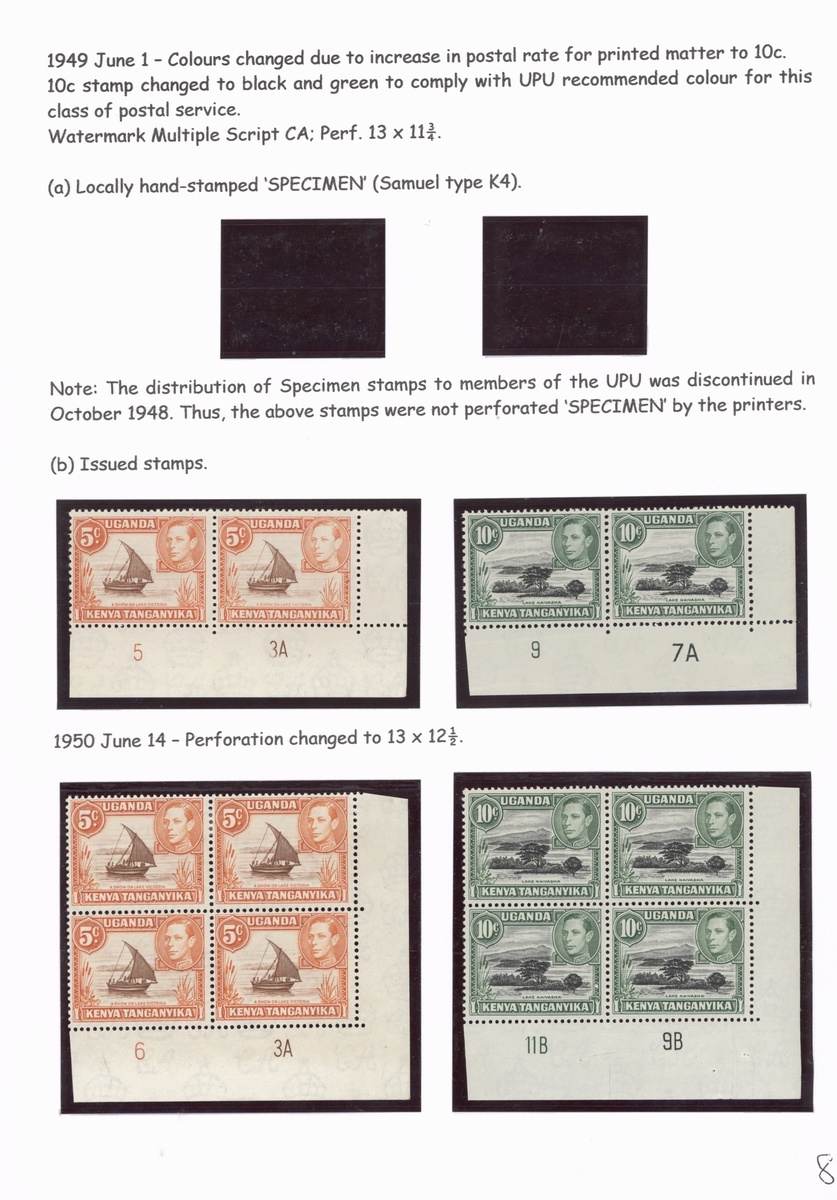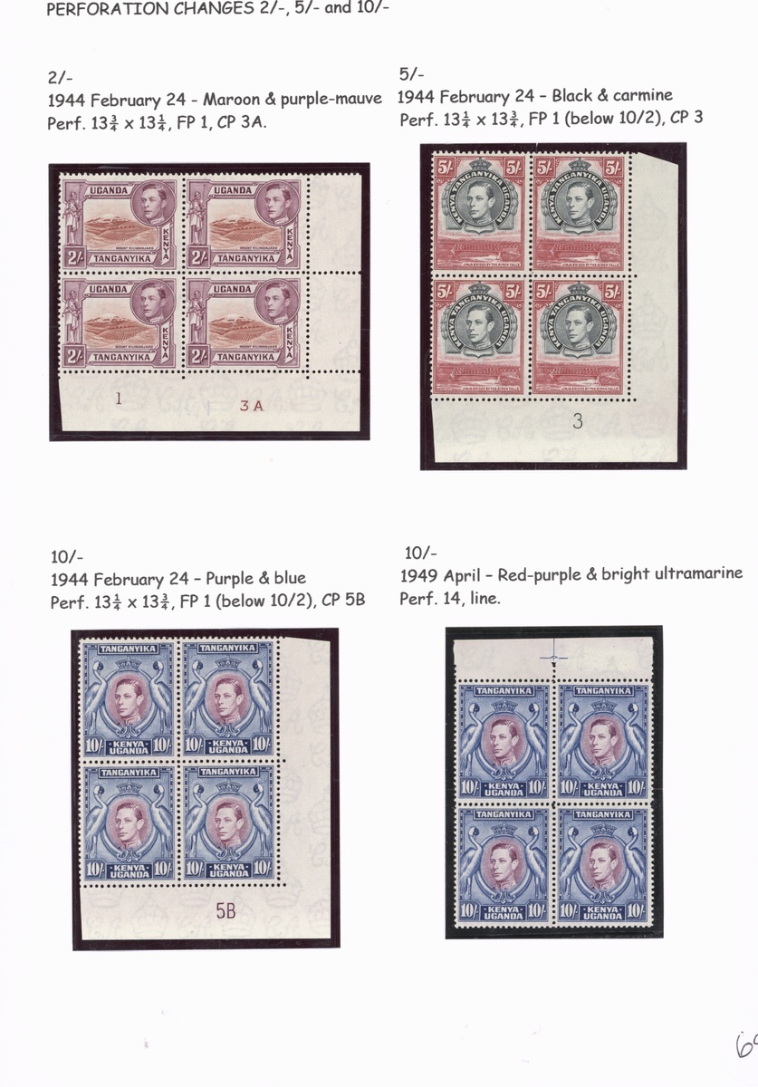 5c. reddish brown and orange, 10c. black and green, 50c. (6), 1/- (2), 3/- , 2/-, 5/- and 10/- in lower right corner blocks of four, 5c. reddish brown and orange, 10c. black and green and 1/- in lower right corner pairs, various perfs, all with plate numbers (all different), plus 3/- and 10/- marginal blocks of four, fine mint. Cat. £2000