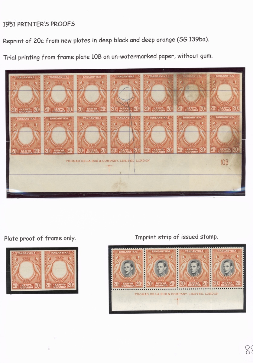 20c. imperforate proof of the frame in orange on thin unwatermarked paper, a lower right corner block of sixteen (8x2) with imprint and plate number, both rows crossed by ruled line and the fourth stamp in top row with printer's correction mark, the right half with staining; also a pair without ruled line, the issued stamp in an imprint strip of four, plus six pieces of printer's waste