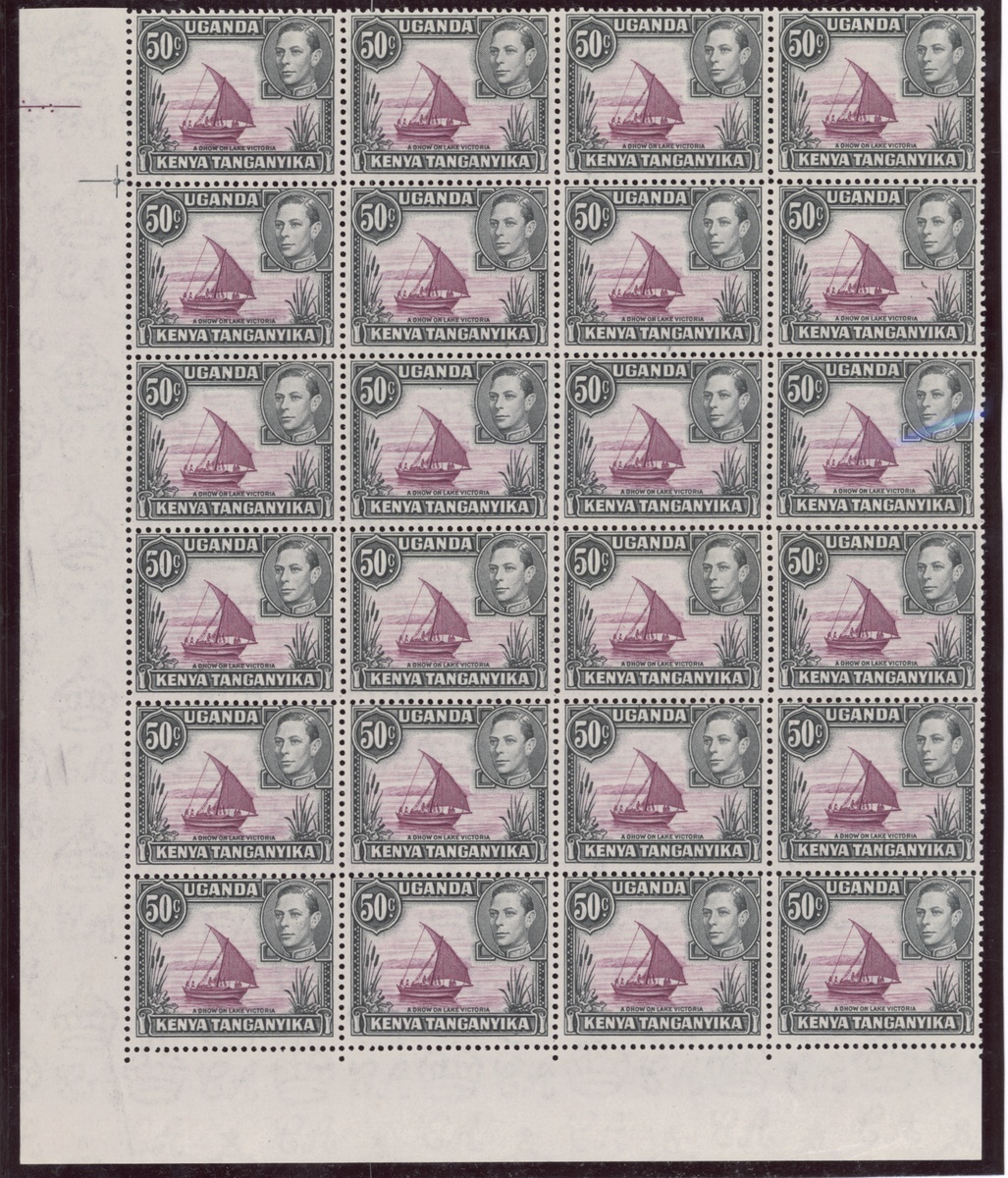 50c. purple and black, perf 13x12½, a lower left corner block of twenty-four (4x6), R.5/2, 6/1, 7/2, 7/4 and 9/1 with dot, fine mint. S.G. 144e/eb, £2696