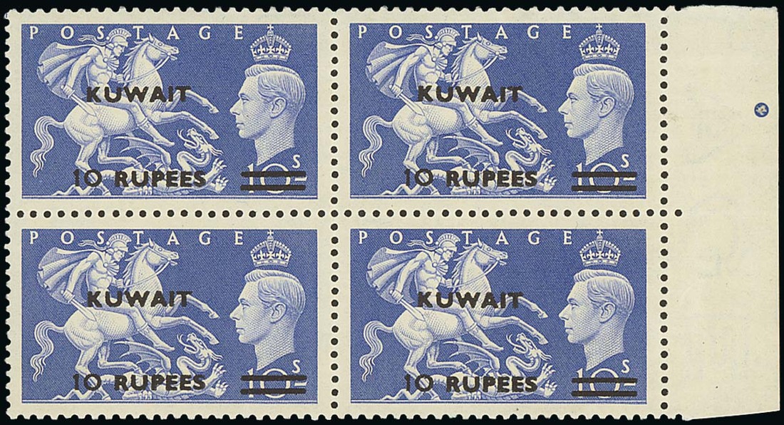 1950-55 10r. on 10/- ultramarine, type II surcharge, block of four from the right of the sheet, unmounted mint, fine and scarce. S.G. 92a, £1,500+. Photo