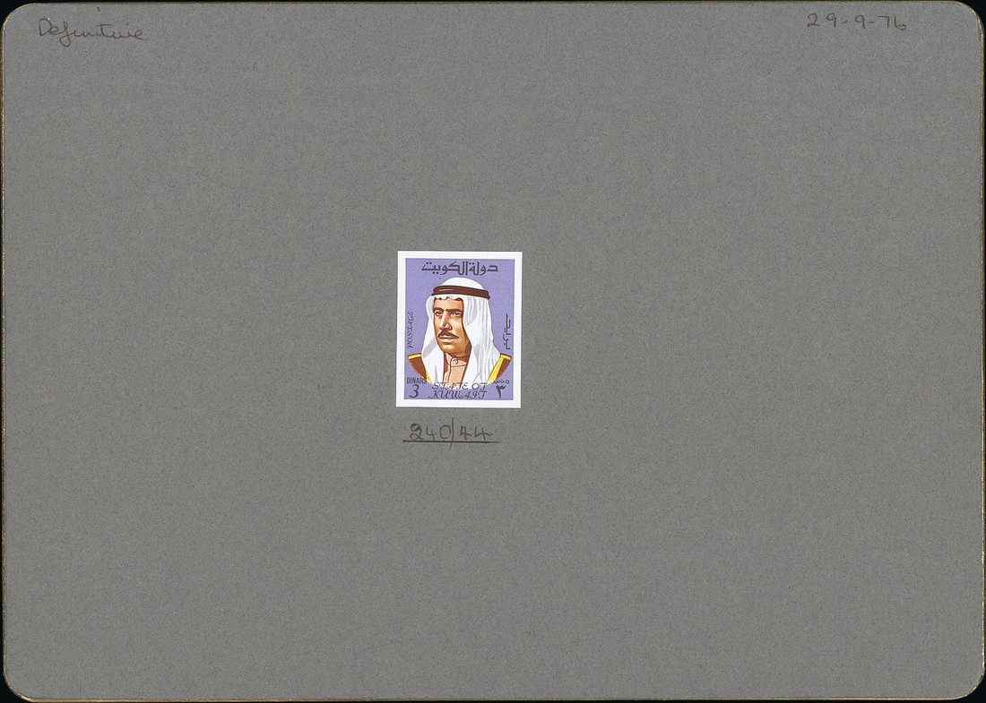 1969-74 Amir Shaikh Sabah, prepared for use but unissued 3d. imperforate affixed to De La Rue card dated 29-9-76 and with file number 240/44; unique and previously unrecorded. Photo