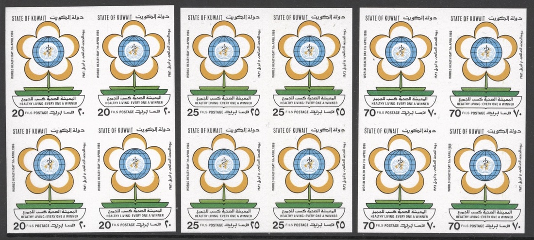 1986 World Health Day set of three in unissued colours in imperforate blocks of four, unmounted mint, fine. S.G. 1103-1105vars.