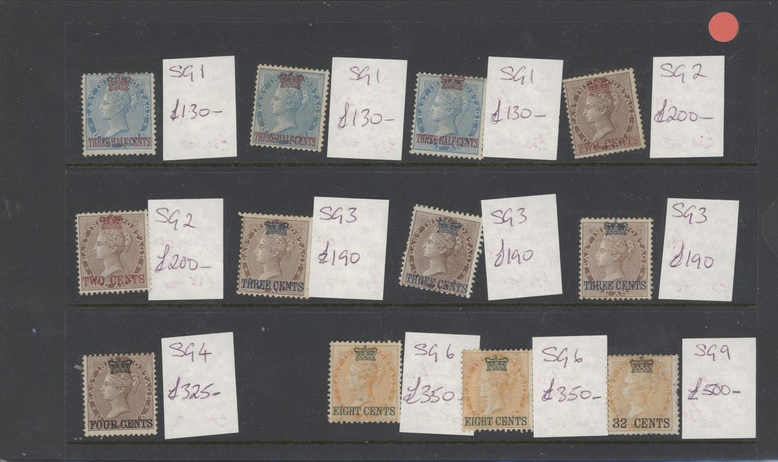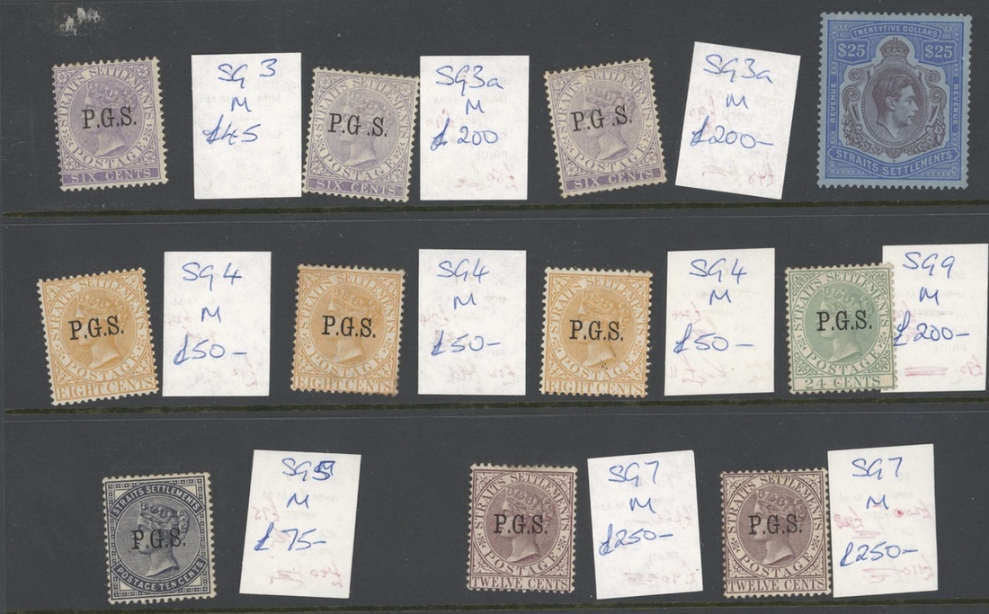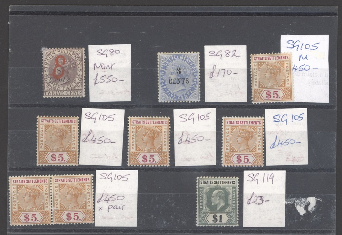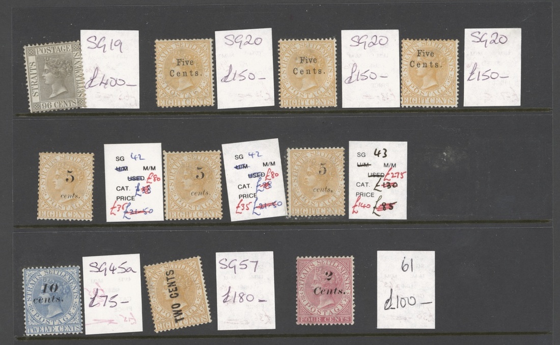 A selection on stock cards etc. including 1847 pre-stamp lettersheet from Manilla to London with "Singapore Bearing" boxed Type 7b, 1867 surcharged on India 1½c. (3), 2c. (2), 3c. (3), 4c., 8c. (2) and 32c. unused, 1867-72 96c. unused, a few 1879, 1880 and 1883 surcharges unused, 1884 8c. on 12c. brown-purple with variety