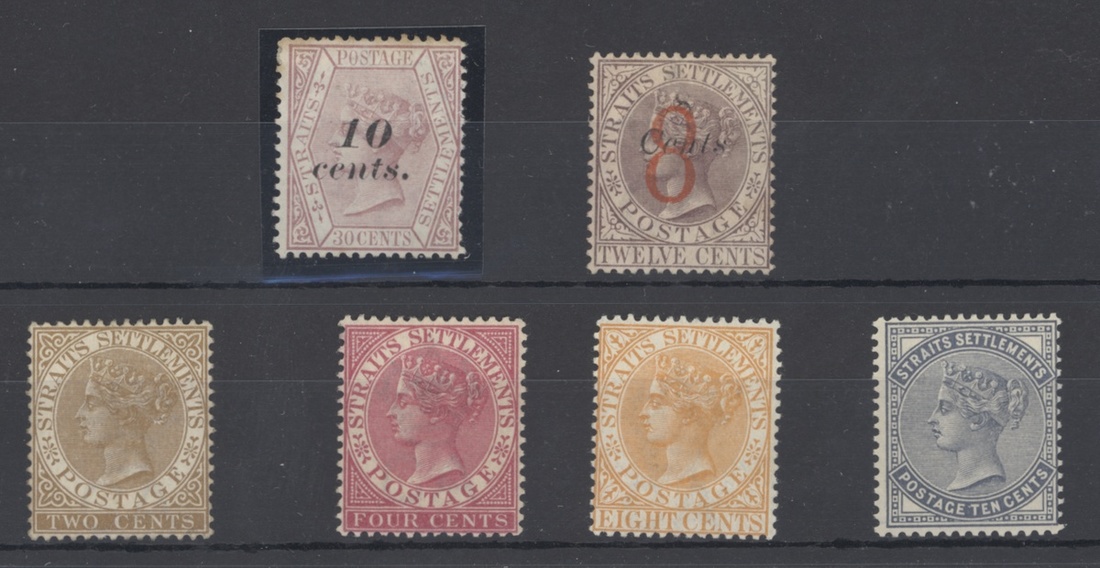 1880-81 "10/cents" on 30c. claret (lightly stained perfs at top), part original gum; 1882 CA 2c. (regummed), 4c., 8c. and 10c. mint; and 1884 (Sept.) "8" on 8c. on 12c. brown-purple, regummed. S.G. 46, 50-53, 80; £1609