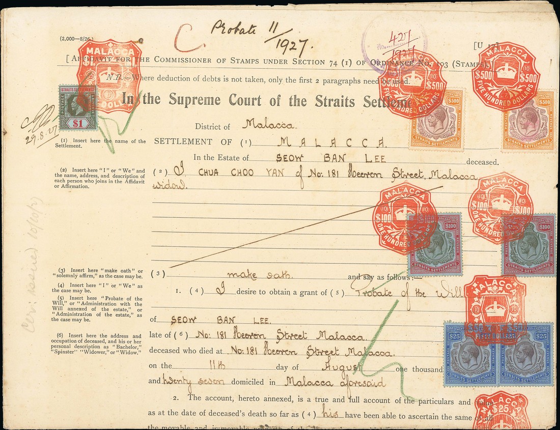 1927 (10 Oct.) Affidavit bearing 1921-33 Script 4c. (4), 25c. (2), 50c. (2), $1 (2), $2, $25 (3), $100 (2, one with broken crown and scroll) and $500 (2), all tied by Malacca red embossed datestamp, fine. Photo