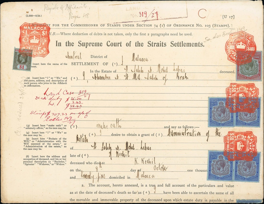 1927 (23 Dec.) Affadavits bearing 1921-33 Script 5c., 10c., 50c., $1, $2, $5 pairs (2), $25 pair and singles (3, one damaged through heavy crease) and $100 showing damaged leaf at bottom right, all tied by Malacca red embossed datestamp, fine. The $100 very rare. Photo