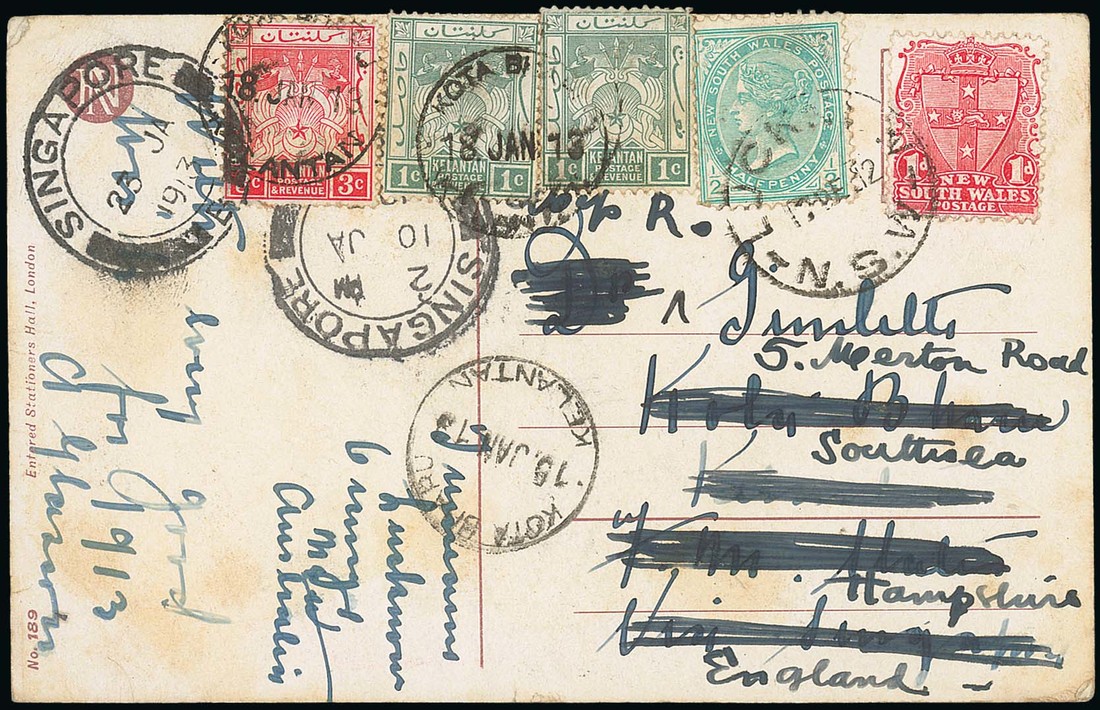 1912 (17 Dec.) picture postcard ex the Gimlette correspondence from Lucknow, New South Wales to Kota Bharu, franked at 1½d. and showing Singapore transit c.d.s. (10.1.13); upon arrival the card re-addressed to England, bearing 1911 1c. (2) and 3c. tied by