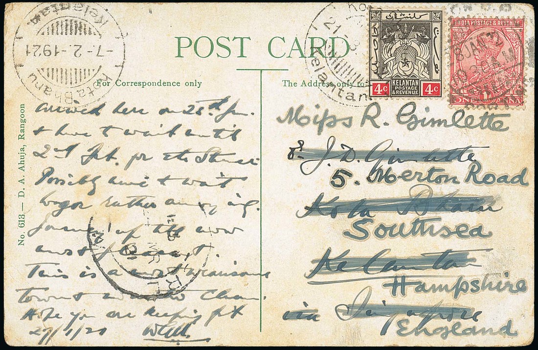 1921 (28 Jan.) picture postcard ex the Gimlette correspondence from Burma to Kota Bharu, bearing India 1a. tied by Rangoon c.d.s., showing Singapore and arrival c.d.s. (7.2); upon arrival the card re-addressed to England, bearing 1911 4c. tied by "Kota Bharu/Kelantan" c.d.s. (21.3; Type D1). A rare and unusual usage. Photo