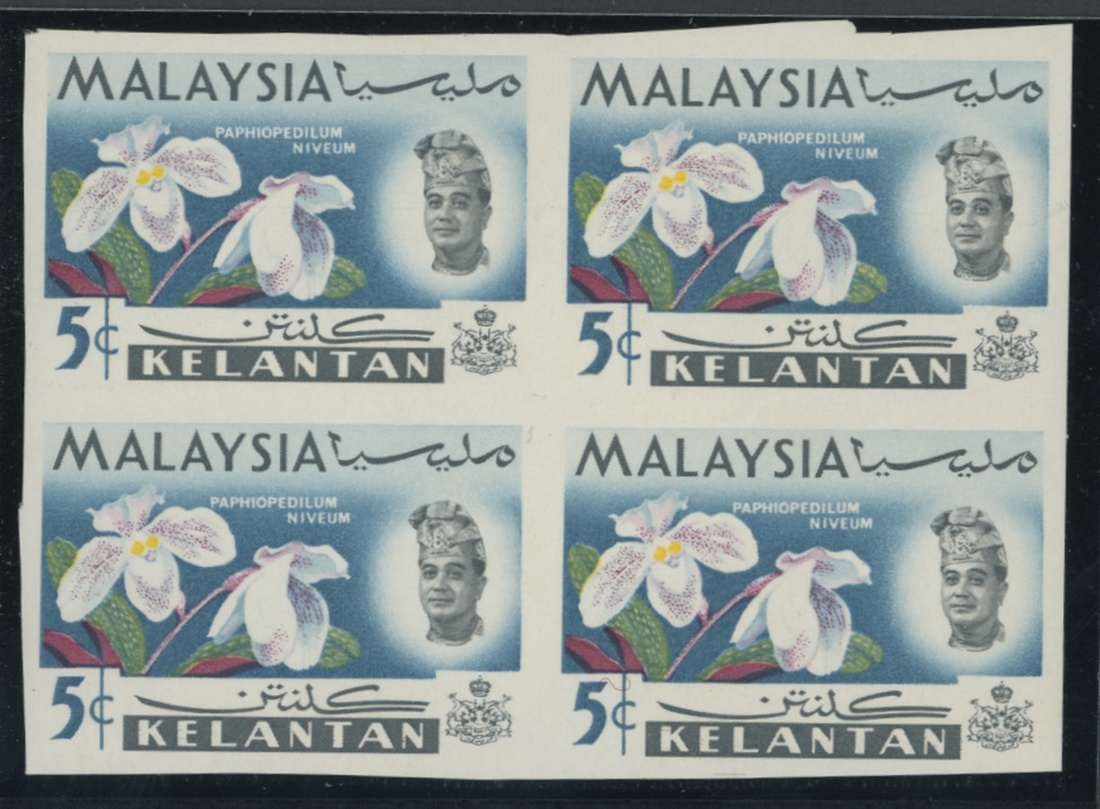 1965 Orchid 5c., an imperforate block of four, one with slight wrinkle otherwise fine unmounted mint. ISC 102g, $1,600