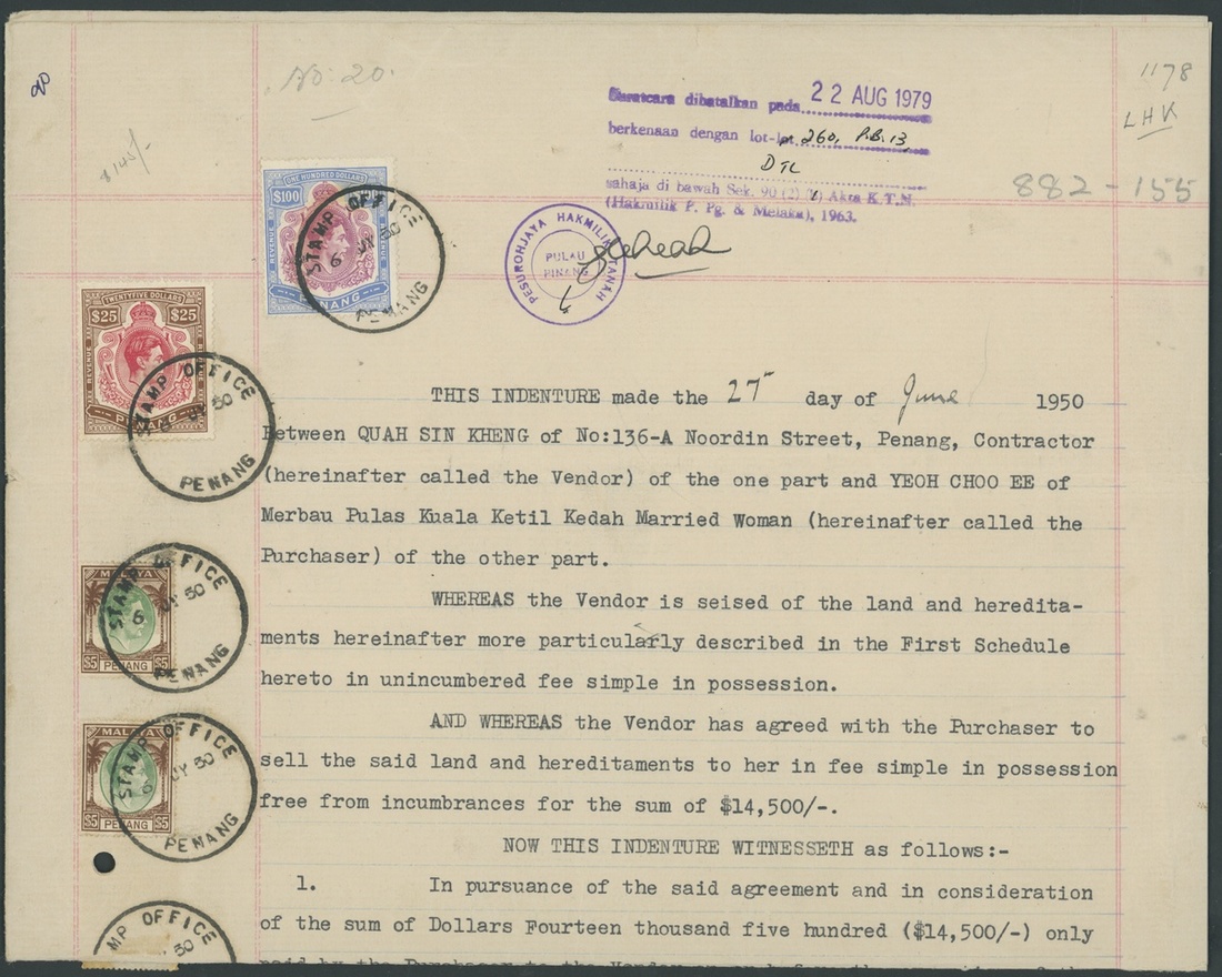 1950 (6 July) Indenture bearing Postage $5 (4, one creased) and 1949 $25 and $100, all tied by
