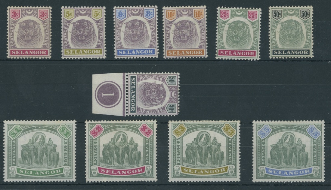 1895-99 3c. to $5, unused with mainly large part original (50c. green and black with large hinge remnant), the 50c. dull purple and greenish black with plate number; the $3 with thin, the others fine. S.G. 54-64, £1450