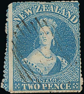 2d. blue showing portions of adjoining stamp at left, serrates intact, or nearly so, on all sides, lightly cancelled "12" at Wanganui (Petre). Almost certainly the finest known example of this rarity. R.P.S. Certificate (2000). S.G. 23, £3,750. Photo