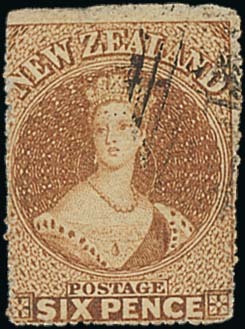 6d. brown, serrates on three sides, large imperforate margin at top, cancellation at upper right leaving much of design clear; minor thin spot though of fine appearance for this rare stamp. S.G. 24, £3,500. Photo