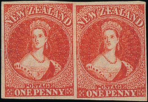 1d. vermilion horizontal pair, good to large margins, fresh colour and with large part original gum. A fine and rare multiple of this attractive shade. S.G. 34, £1,500. Photo