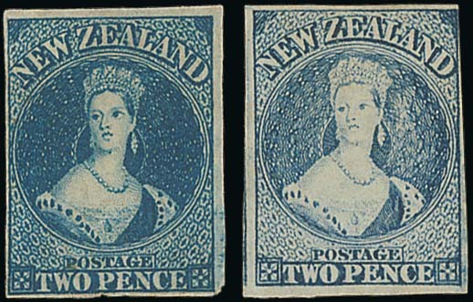 2d. blue Plate I with clear to large margins and 2d. pale blue Plate I, worn with just clear to very large margins showing trace of adjoining stamp at left, both with close to large margins and unused without gum; both with creases and the latter with a thin spot though of good appearance and an attractive contrasting pair S.G. 36, 38, £1,600. Photo