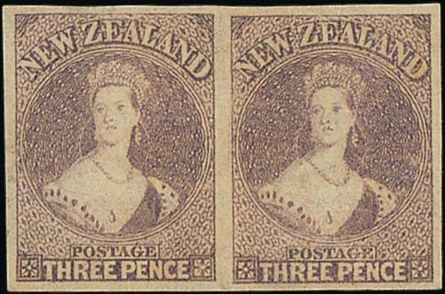 3d. brown-lilac, a horizontal pair with good to large margins, large part original gum; natural horizontal gum wrinkle, otherwise fine and scarce. S.G. 40, £1,200. Photo