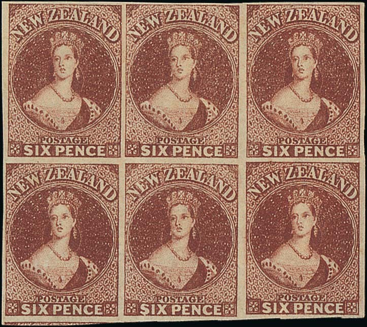 6d. red-brown, a block of six with clear to very large margins and showing portion of adjoining stamp at base of lower left stamp, large part original gum and in a lovely fresh colour; light vertical bend between the left-hand block of four not affecting the superb appearance of this very rare and important multiple. Signed Holcombe. S.G. 43, £10,200+. Photo