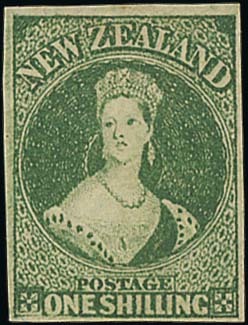 1/- green, good to large margins, fresh unused with part original gum; light horizontal gum crease at top, otherwise fine and a most attractive example of this rare stamp. S.G. 44, £2,500. Photo