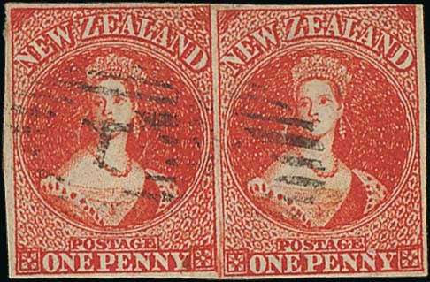 1d. orange-vermilion, a horizontal pair with clear to large margins, both cancelled "1" at Auckland; small crease at top, otherwise fine and a scarce used multiple. S.G. 35, £600. Photo