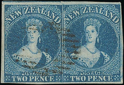 2d. deep blue Plate I, a horizontal pair with clear to large margins showing trace of adjoining stamp at top left, lightly applied cancellation leaving nearly of right-hand stamp portrait clear; very fine. S.G. 36, £190+. Photo