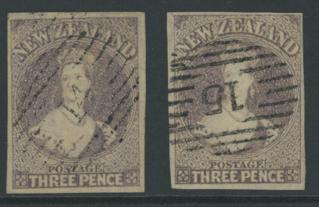 3d. brown-lilac, two examples with clear or good to large margins, one cancelled "14", the other "15" at Nelson; fine with the former particularly attractive and signed Holcombe. S.G. 40, £320