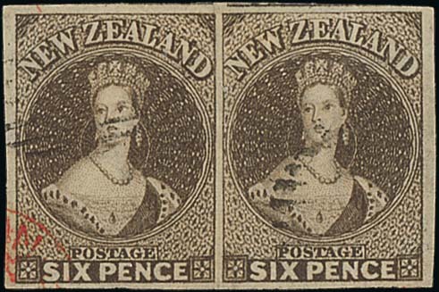 6d. black-brown, a horizontal pair with good to large margins and showing trace of adjoining stamp at upper right, both lightly cancelled and showing small part of red datestamp at lower left corner; very fine and most attractive. Vollrath handstamps on reverse of both. S.G. 41, £260+. Photo