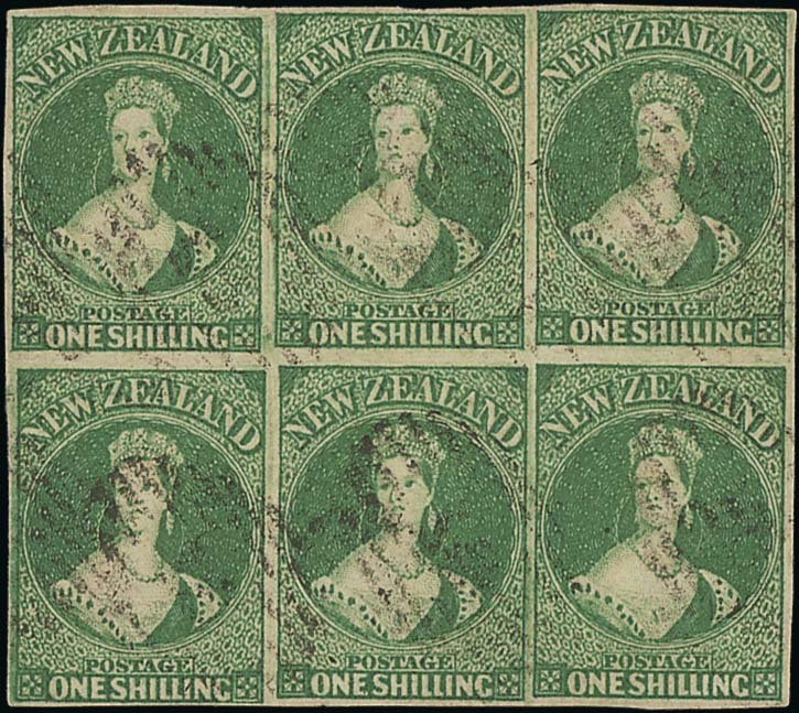 1/- green, a block of six (3x2) in an unusual shade with hints on blue, clear to large margins and with generally light indistinct numeral cancellations; a sound and very rare multiple. S.G. 44, £1,950+. Photo