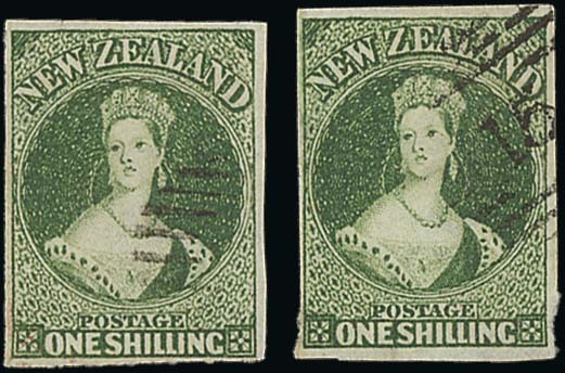1/- green, two examples in slightly varying shades, both with clear to large or very large margins, one cancelled "15" at Nelson, the other with small part cancellation, both leaving much of portrait clear. An attractive duo. S.G. 44, £650. Photo