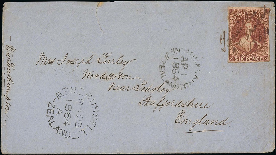 1864 (22 Mar.) envelope from Taraire "via Southampton" to England, bearing 6d. red-brown (a fraction soiled in margins) with clear to large margins and most unusually cancelled by manuscript "Tairaire/22 March/1864", showing Russell (22.3) and Auckland (1.4) datestamps on face, the reverse (less flap) with small part arrival datestamp in June. Fine and rare. Photo