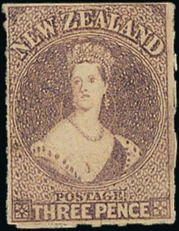 3d. brown-lilac, roulettes, or traces thereof, on three sides, imperforate at top, good colour, unused with part original gum. A pleasing example of this rare stamp. B.P.A. Certificate (1987). S.G. 52, £3,750. Photo