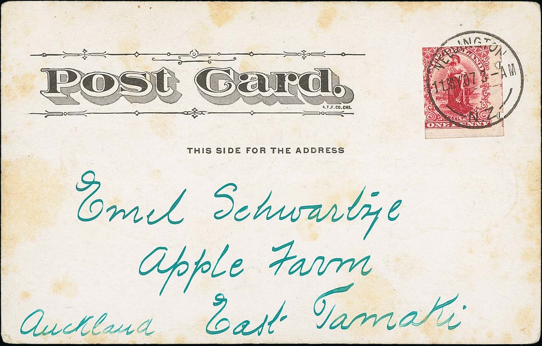 Imperf. all round, two large holes at each side, Waterlow "reserve" plate 1d. deep carmine, neatly cancelled by Wellington datestamp on 1907 (11 May) comic postcard to East Tamaki; minor soiling though a rare stamp on cover. R.P.S. Certificate (1978). S.G. 366, £300+. Photo