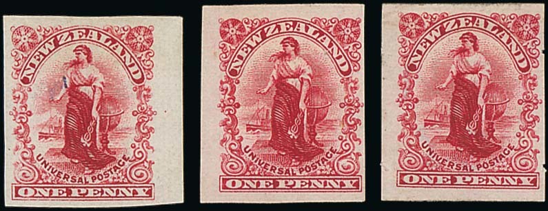 Imperf. all round 1d. deep carmine-red; imperf. all round, two small indentations on back of stamp 1d. deep carmine-red, and imperf. all round, two small pin-holes in stamp 1d. deep carmine-red, large part original gum; the first with a small mark on face, otherwise good to fine. R.P.S. (1968) for last two. S.G. 367-369, £605. Photo