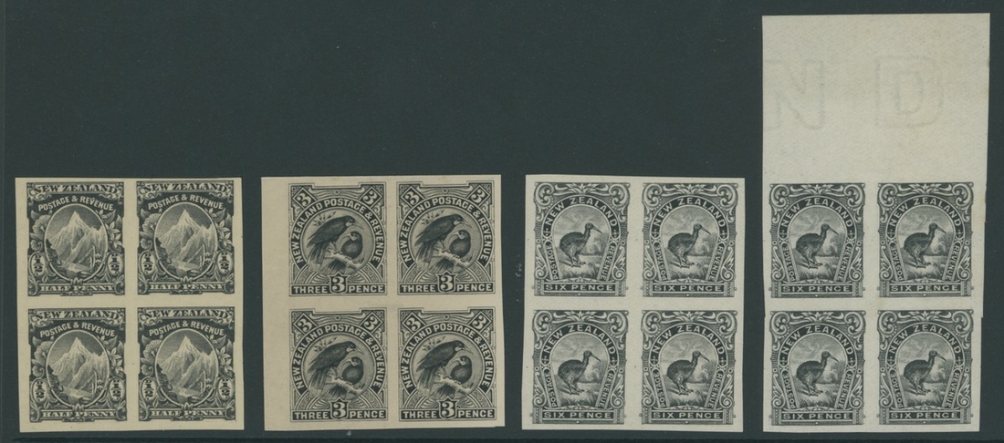 A selection of imperforate plate proofs in black, comprising ½d. and 3d. (2, one from the lower left corner) blocks of four, 3d. and 6d. horizontal pairs, all on unwatermarked paper, and 6d. blocks of four (3, one marginal) on gummed watermarked paper