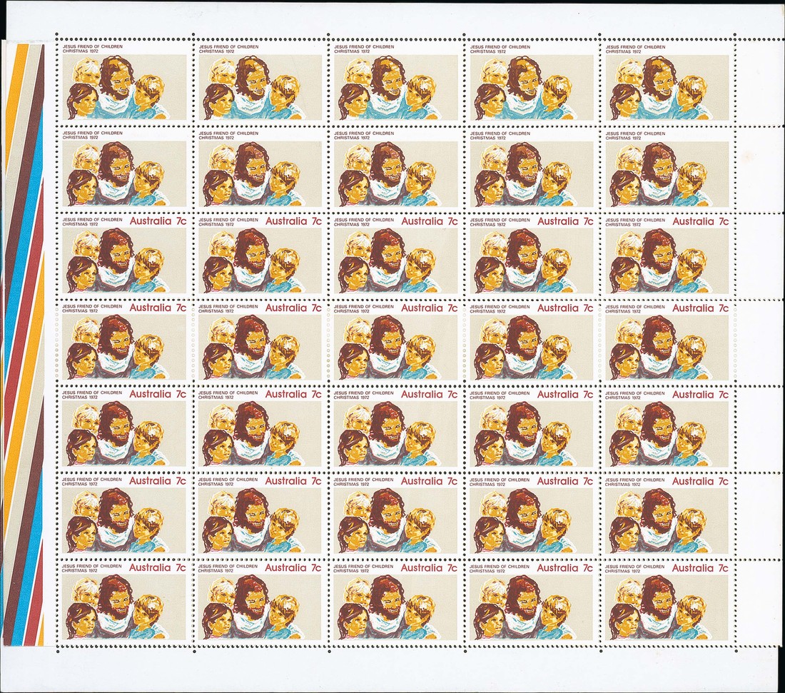 (x) 1972 (Nov.) Christmas 7c., a complete sheet (folded), the top row with red ("Australia 7c" etc.) omitted and the second row with partial omission, fine unmounted mint. BW 620ce, $15,000; S.G. 530a, £12,500. Photo