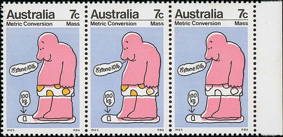 (x) 1973 (Mar.) Metric Conversion 7c. ("Mass"), a strip of three with margin at right, the last stamp with yellow-orange omitted, a fraction gum toned and the centre stamp with bend, unmounted mint. BW 622ca, $4000 for a strip of five; S.G. 534a, £4000. Photo