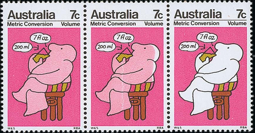 (x) 1973 (Mar.) Metric Conversion 7c. ("Volume") strip of three, the last stamp with pink omitted and the adjacent stamp small part missing, fine unmounted mint. BW 623ca, $1750; S.G. 533b, £1700. Photo