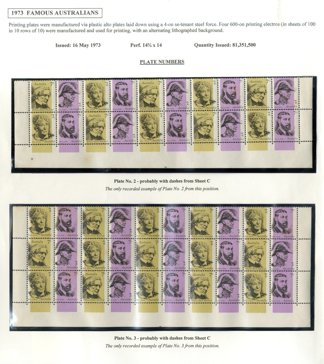(x) 1973 (May) Famous Australians, two blocks of twenty (10x2) and thirty (10x3) from the foot of sheets, the former showing small part Plate No. 2 and the latter with very small part Plate No. 3, both with some light tone marks on reverse not affecting appearance, unmounted mint. The only recorded examples from this position. BW 630za, 630zb, $2500