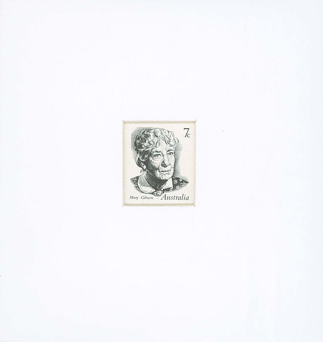 (x) 1973 (May) Famous Australians Gilmore 7c. engraved die proof in black, inset on thick non-contemporary card (95x100mm.), fine. Photo
