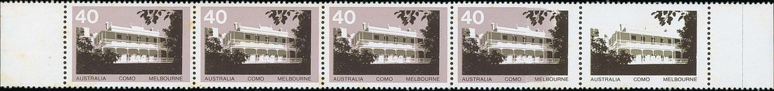 (x) 1973 (Oct.) Architecture 40c. strip of five with margins at ends, the last with pink omitted and the adjacent stamp with partial omission, some light stains on reverse not affecting appearance. BW 656ca, $4000; S.G. 558a, £2250+. Photo
