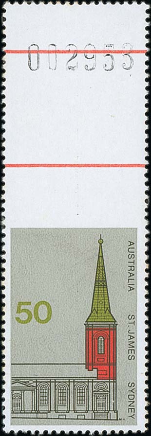(x) 1973 (Oct.) Architecture 50c. with gutter margin at top with sheet no. 002958, variety imperforate between stamp and margin, fine unmounted mint. BW 657ba, $1500. Photo