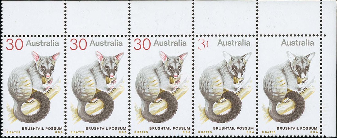 (x) 1974 (Feb.) Animals 30c. top right corner strip of five, the last with carmine-red (face value, etc.) omitted with the adjacent stamp showing partial omission, fine unmounted mint. BW 662ca, $4500; S.G. 563a, £1200+. Photo