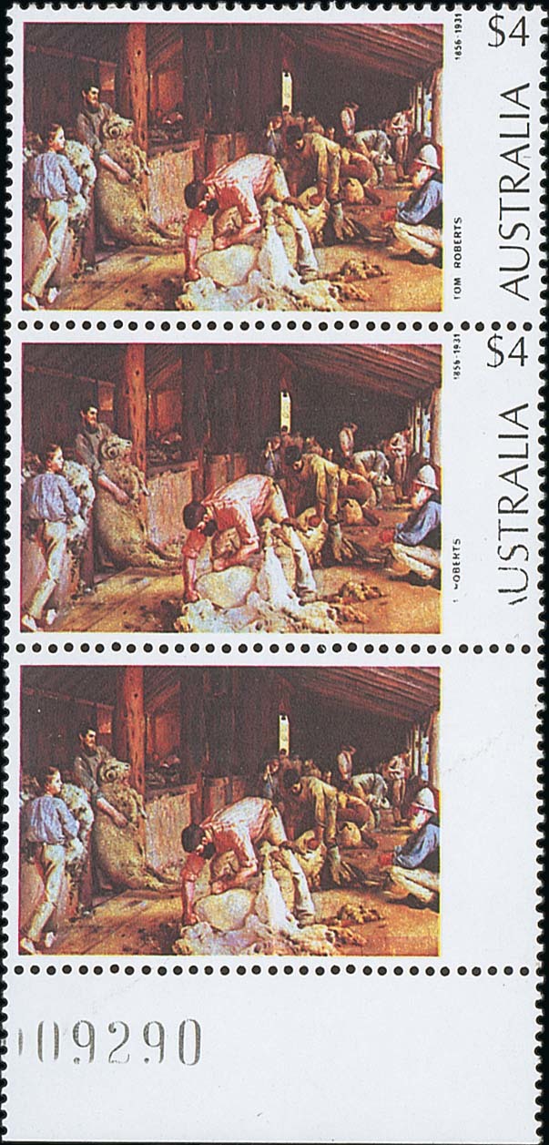 (x) 1974-79 Paintings $4 vertical strip of three with margin at foot showing sheet number at foot, the bottom stamp with black (face value and inscription) omitted and the stamp above with small part omission, fine unmounted mint. Rare. BW 666ca, $5500; S.G. 566ba, $3000+. Photo