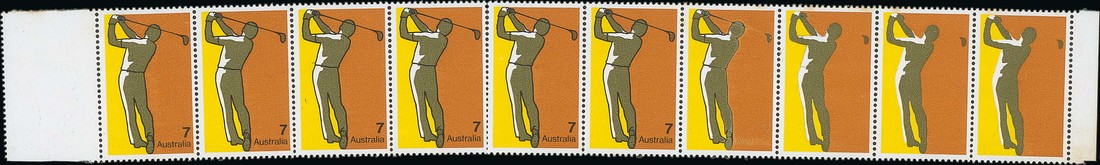 (x) 1974 (July) Non-Olympic Sports 7c. (Golf), a strip of ten with margins at ends, the last three with black (face value and inscription) omitted and the adjacent stamp with partial omission, some stains on reverse not affecting appearance, unmounted mint. Very rare. BW 671ca, $8500; S.G. 573a, £4800+. Photo
