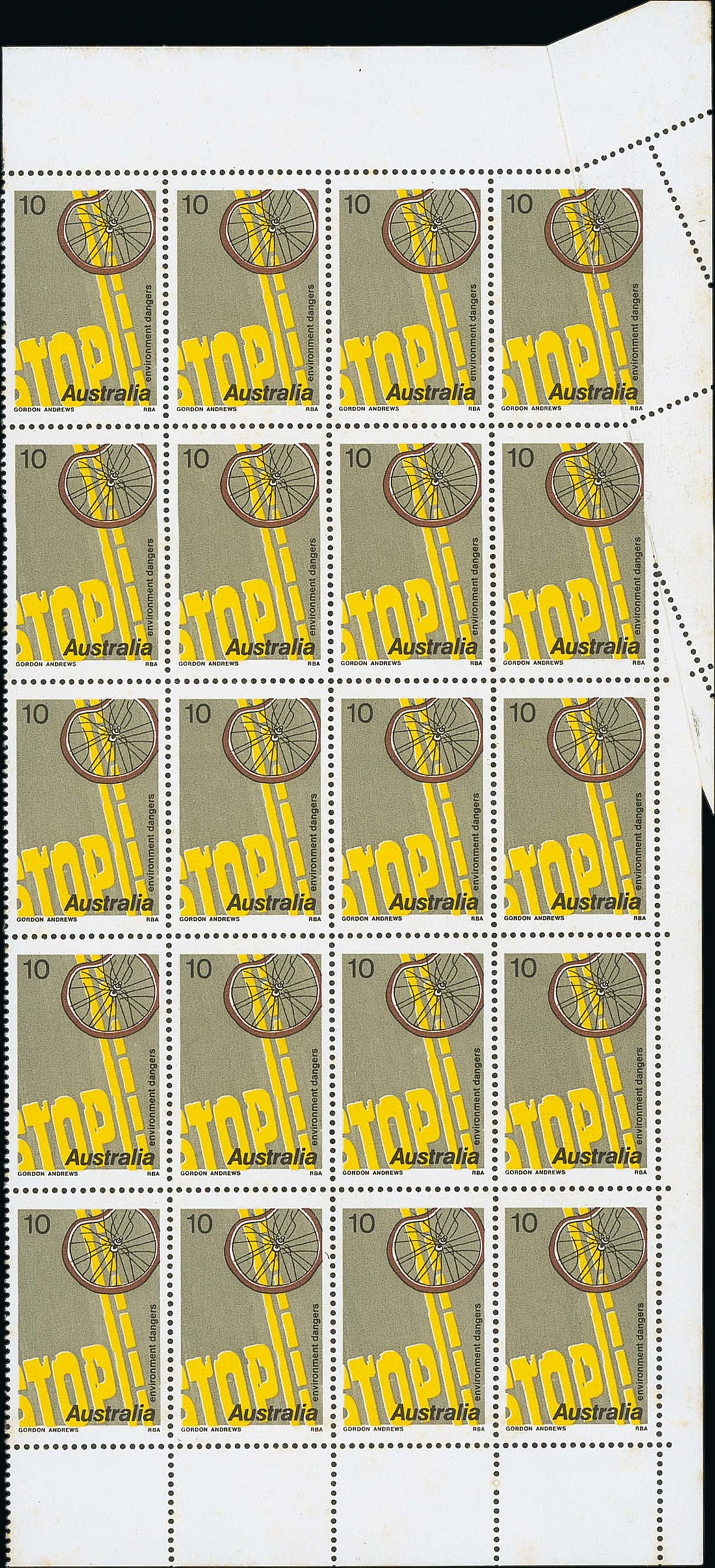 (x) 1975 (Jan.) Environmental Dangers 10c., a marginal block of twenty (4x5) being the last four rows of the sheet, the top right corner vertical pair imperforate and partly imperforate between stamp and margin at right due to paper fold, fine unmounted mint. Unlisted in Brusden White. Photo