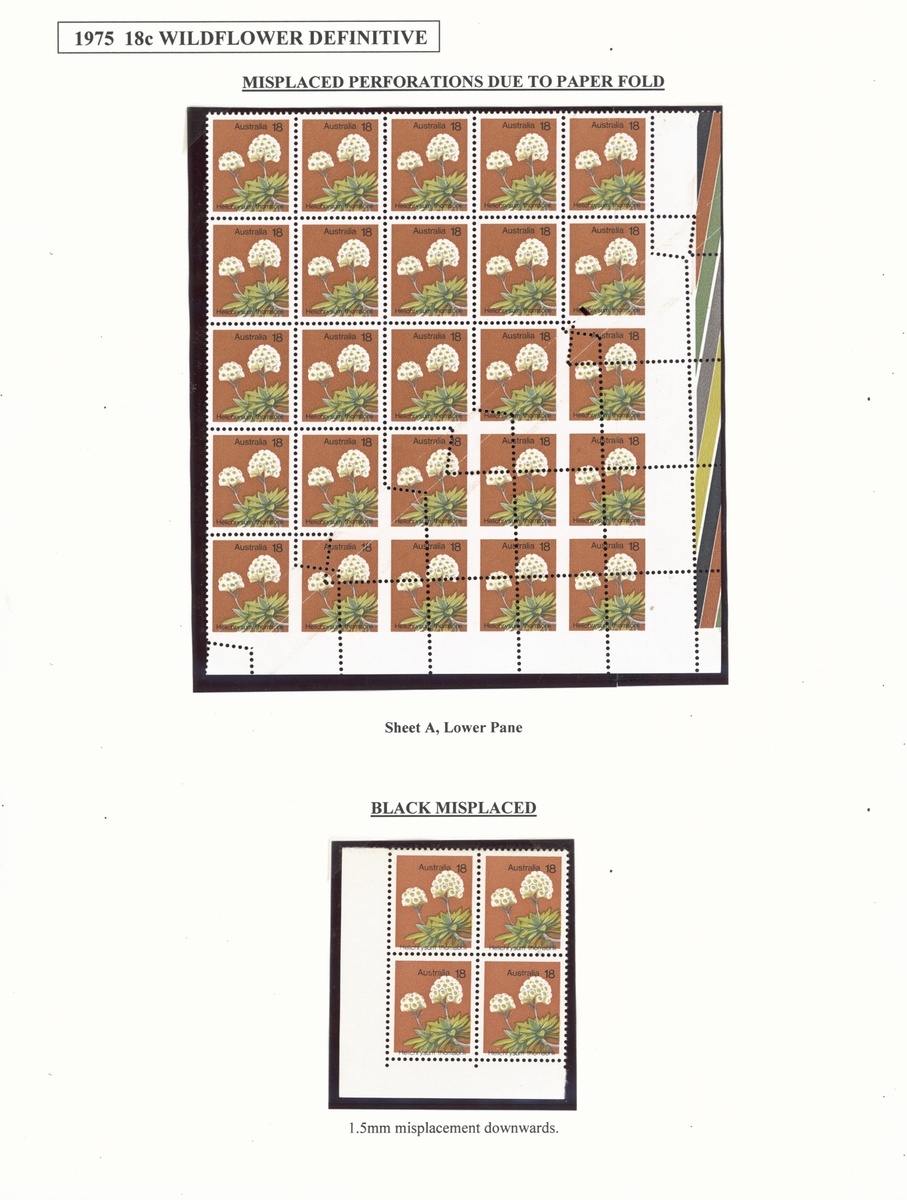 18c., a lower right corner block of twenty-five with colour bars at right showing major misplacement of perforations due to paper fold, and a lower left corner block of four showing black misplaced 1.5mm. downwards, fine unmounted mint. Unlisted in Brusden White