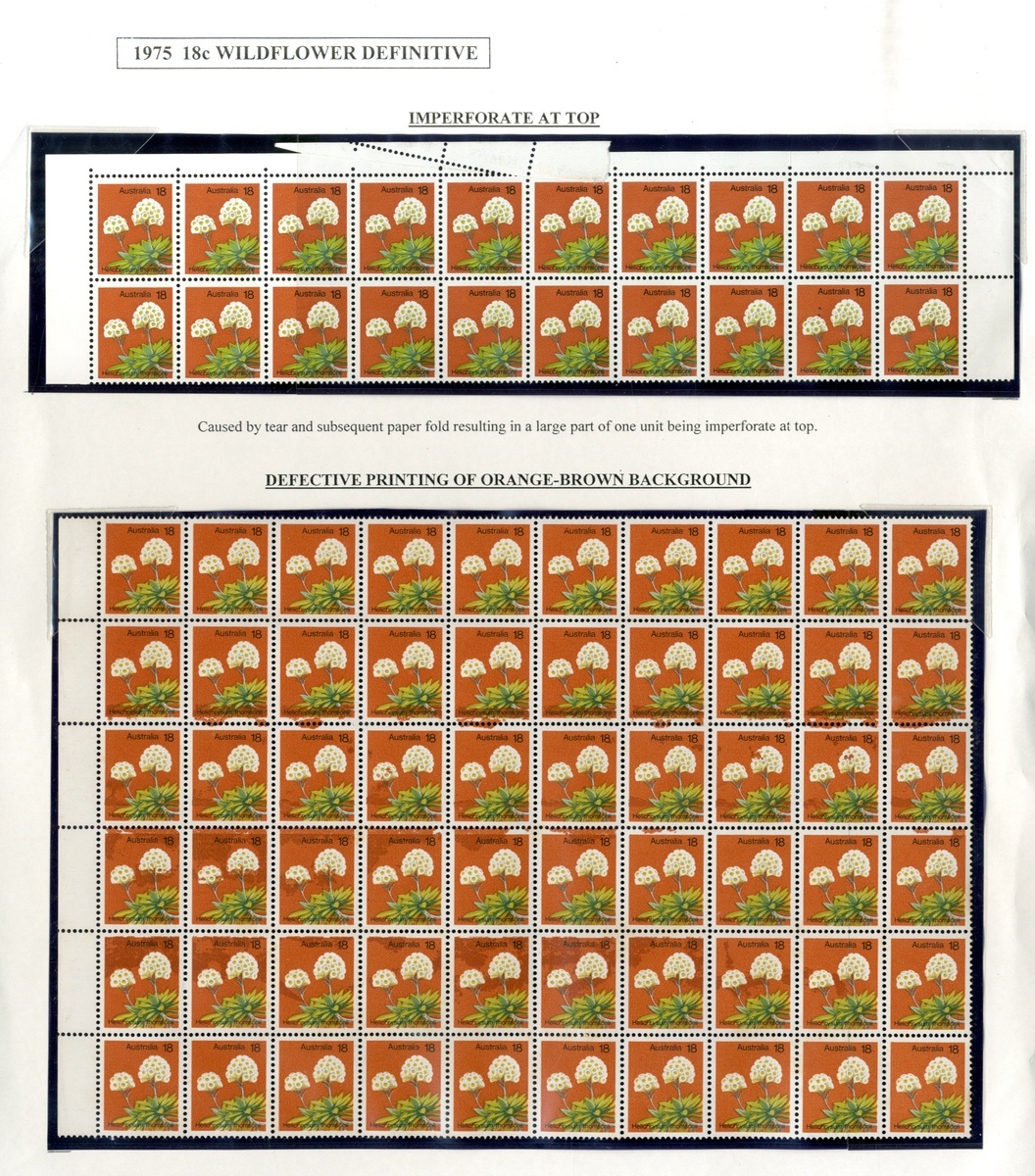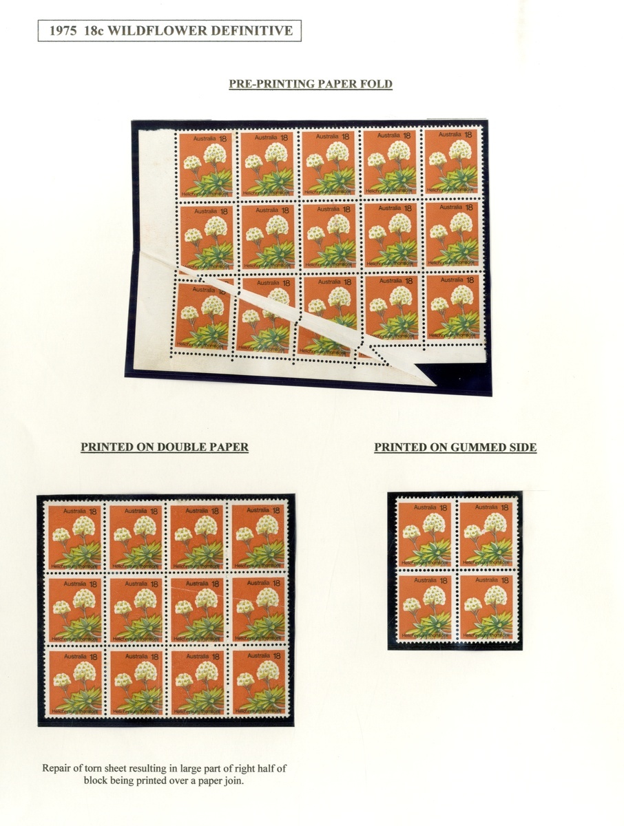 18c., a block of twenty being the top two rows with one imperforate at top caused by tear and subsequent paper fold, a block of sixty (10x6) with margin at left showing defective printing of orange-brown back ground, a lower left corner block of fifteen (5x3) showing major pre-printing paper fold, a block of twelve (4x3) printed on double paper (repair of torn sheet resulting in large part of right half of block being printed over paper join), and a block of four printed on the gummed side, fine unmounted mint